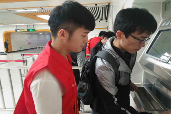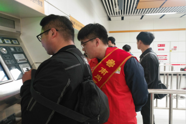 上午8时,下午4时30分,唐登高、任建宇分别带着20160113、20150111团支部来到地铁站,在向地铁站工作人员报到之后开始了本次的志愿服务活动。志愿者分成三组,其中两组的志愿者来到地铁站两侧的自动售票机,帮助一些不会用的乘客购买地铁票。另外一组志愿者待在负一层,其中两名同学站在交通引导牌下,向来往行人指路,另外两名同学站在验票处口,让行人有序出站,并为乘车车票出现问题的行人联系站内工组人员。