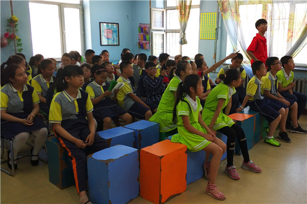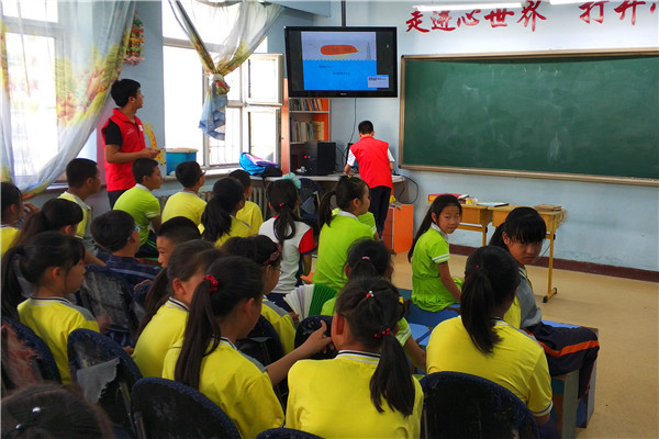 志愿者们在图书馆门口集合后一起乘车前往通乡小学。在与通乡小学的老师进行一番沟通后,志愿者开始上课,两名志愿者分别负责讲解与维持课堂秩序。第一节课的内容主要是给孩子们展示海洋风光,在课堂上,志愿者还给同学们介绍了海马、海象、水母等海洋生物。第二节课志愿者给小朋友讲解的是航海历史:从郑和下西洋到哥伦布发现美洲大陆等等。随后,志愿者向孩子们提出问题,并让一些同学到讲台发言。同学们踊跃举手发言,积极参与到课堂活动中并与者愿者们互动。