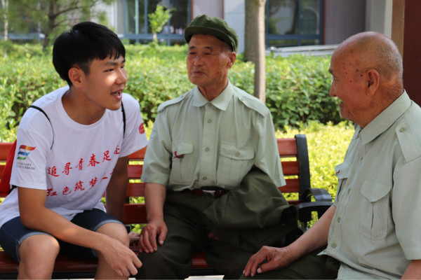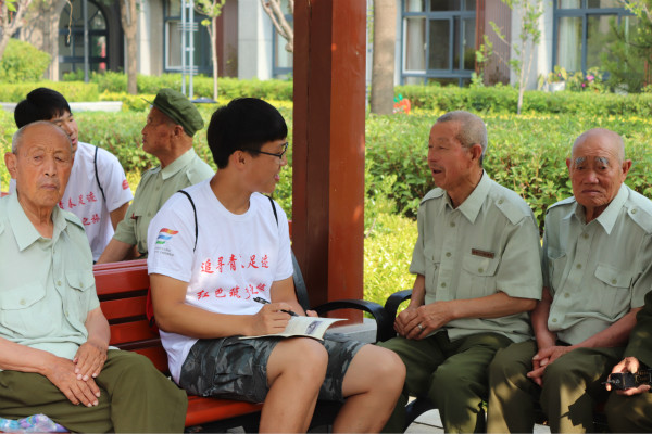 上午八时许,实践团的成员们抵达敬老院。走进敬老院,成员们发现已经有几位老红军战士在活动区的凉亭下乘凉,他们依然精神矍铄,身穿统一的军绿色军装,胸前佩戴着获得的功勋奖章,彰显着光荣的革命荣誉。接着,实践团的成员们拿着事先准备好的礼物,来到了老红军的身边,与他们亲切攀谈,首先介绍了自己所读学校,然后便与老战士们聊起了当年的红色岁月。从谈话中了解到,他们大多已经九十岁了,在十几年乃至几十年的革命岁月中,他们经历了大大小小几十场战斗,面对成员们提出的问题,老战士们都积极解答,讲述自己的所闻所感,还不时叮嘱成员们要好好学习,将来报效祖国。