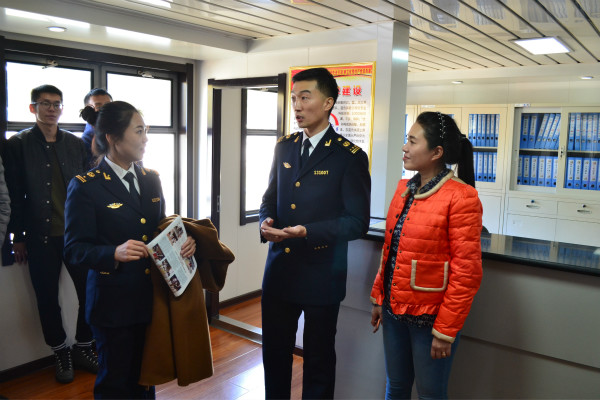 随后,大连海事局交流团队到达码头,员工代表团一起下船迎接,随行大连海事局团队听太平海事局的领导的讲解。包括太平海事“红蓝白”本色海事品牌介绍、监管特色、推动生态文明建设等。最后代表团随同大连海事局交流团一同登上巡查船到松花江附近流域进行参观巡查。
