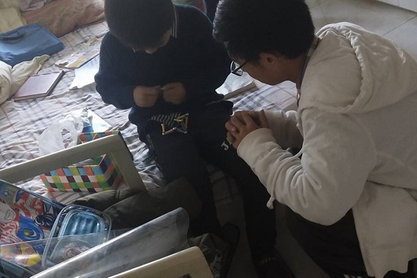 活动中,冯皓阳的家长对同学们的到来表示欢迎,并赞赏同学们的爱心和社会责任感。王海霄与家长进行交流,了解家庭实际情况与冯皓阳的学习、生活状况。王亦晗、董珏宇对冯皓阳进行学业功课与英语基础知识的相关辅导。学习之余,冯皓阳酷爱小发明、小制作,并向同学们展示自己用磁石拼出的作品,同学们也对他进行了科创方面的入门介绍和指导。