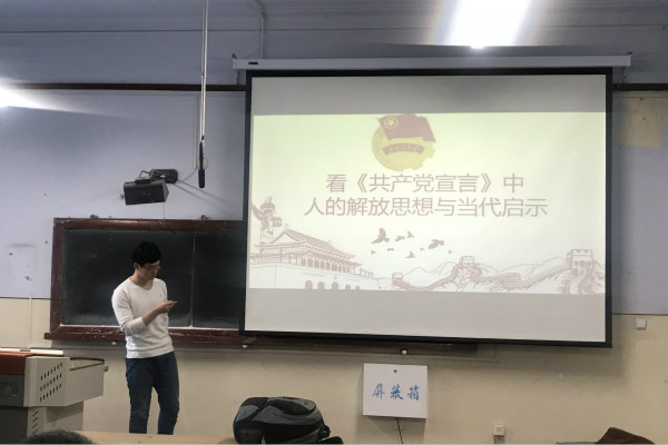 本次活动以“看《共产党宣言》中人的解放思想与当代启示”为主题,旨在深入《共产党宣言》中的思想与启示。活动形式为韩晓剑依照幻灯片对同学们进行讲解,主要从四个方面进行,分别为:《共产党宣言》的社会历史背景;《共产党宣言》的大致内容;《共产党宣言》中关于人的思想解放的内容;《共产党宣言》对于当代社会的启示。韩晓剑对这四个方面进行了详细的介绍,并在最后指出中华民族伟大复兴,绝不是轻轻松松,敲锣打鼓就能实现的。实现中华民族伟大复兴的中国梦,需要我们一代又一代人砥砺前行。